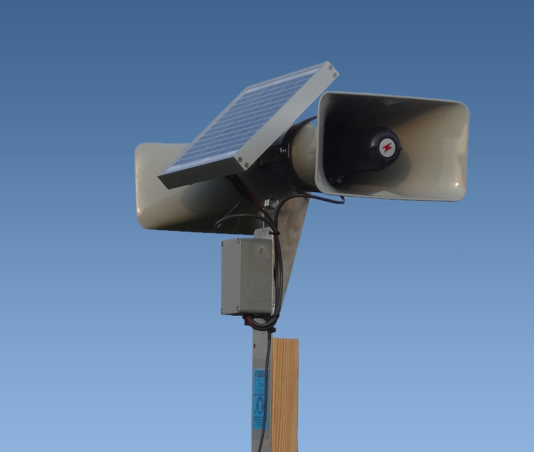 The principle of this acoustic system is to repel birds away from the areas to be protected by imitating their natural enemies.It functions by playing six different sounds for 10 seconds in random order.